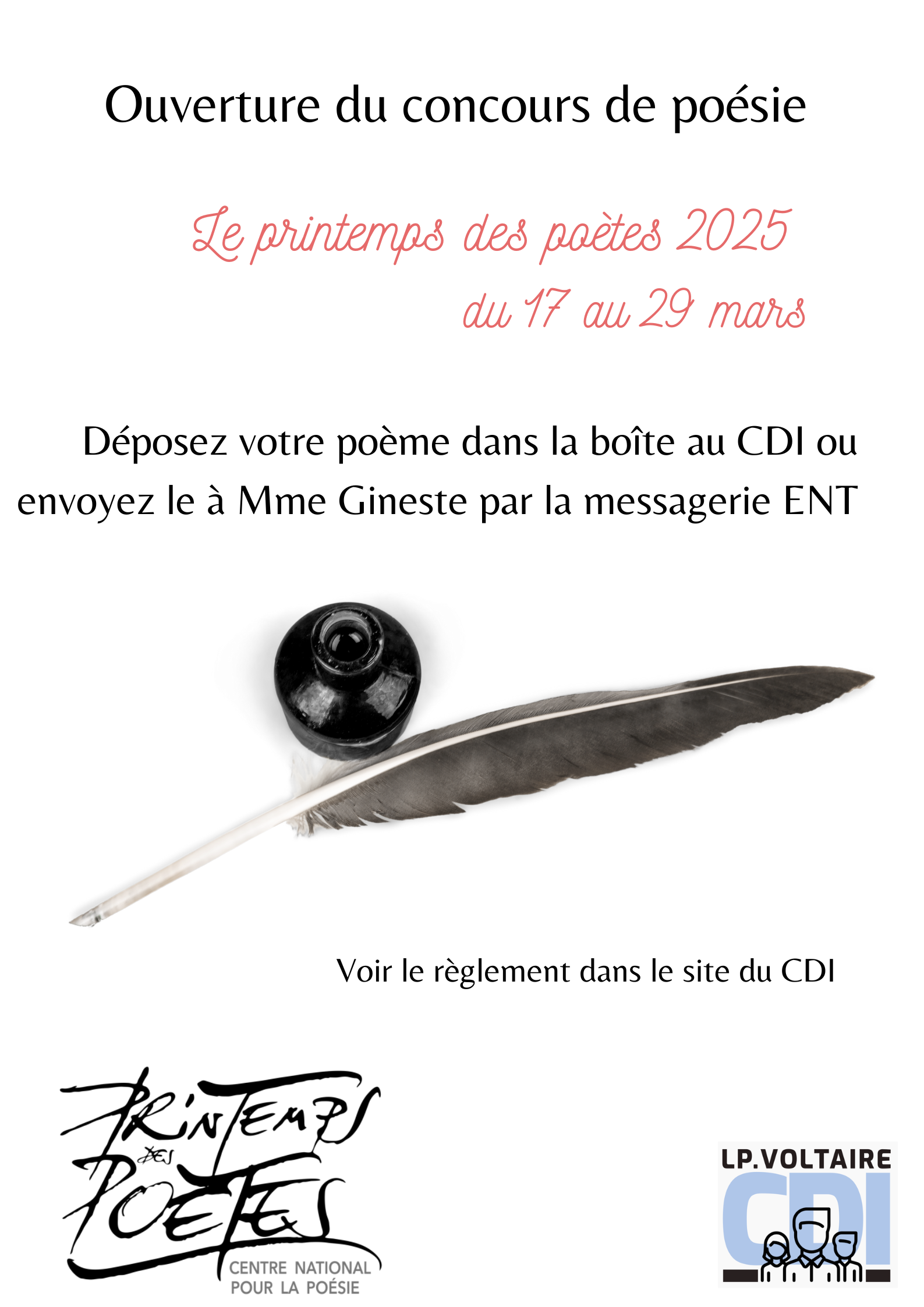 Du 14 au 31 mars 2025, notre établissement participera au Printemps des Poètes, une manifestation nationale et internationale qui célèbre la poésie sous toutes ses formes1. À cette occasion, le CDI organise un concours de poésie ouvert à tous les élèves et personnels du lycée.